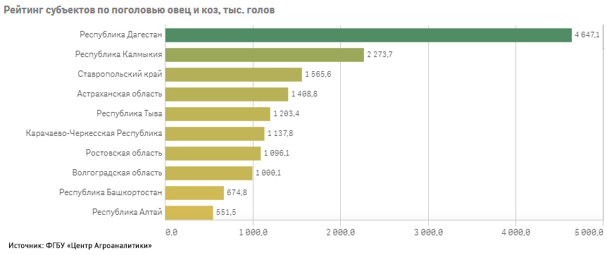 По данным «Центра Агроаналитики» крупнейшими регионом России по поголовью овец является Дагестан. В регионе насчитывается 4,6 млн овец, по этому показателю республика занимает первое место в стране. В текущем году на развитие овцеводства республики будет направлено 343,1 млн руб. (в 2019 году — 300 млн руб.).