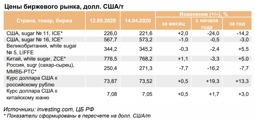 На этом фоне особняком стоит мировой лидер по производству сахара — Бразилия, где по причине благоприятных погодных условий ожидается небывалый урожай сахарного тростника. С начала нового сезона (в Бразилии сезон-2020/21 начался в апреле) к 1 мая измельчено 60,38 млн т тростника (+32,3% к аналогичной дате 2019 года). Из-за снижения привлекательности производства этанола (цены на энергоресурсы в текущем году резко упали) удельный вес переработанного сырья, направляемого на выработку сахара, составил 43,8% (28,7% в 2019 году). Таким образом, за месяц с начала сезона производство сахара составило 3,0 млн т (+15,8% к 2019 г.). Также Бразилия уже начала наращивать объемы экспорта своей продукции: в апреле вывоз продукции достиг 1,6 млн т, что на 9,7% выше, чем в марте, и на 26,5% выше, чем в апреле 2019 года. Благоприятная для Бразилии ситуация с экспортом сохраняется также за счет падения курса реала.