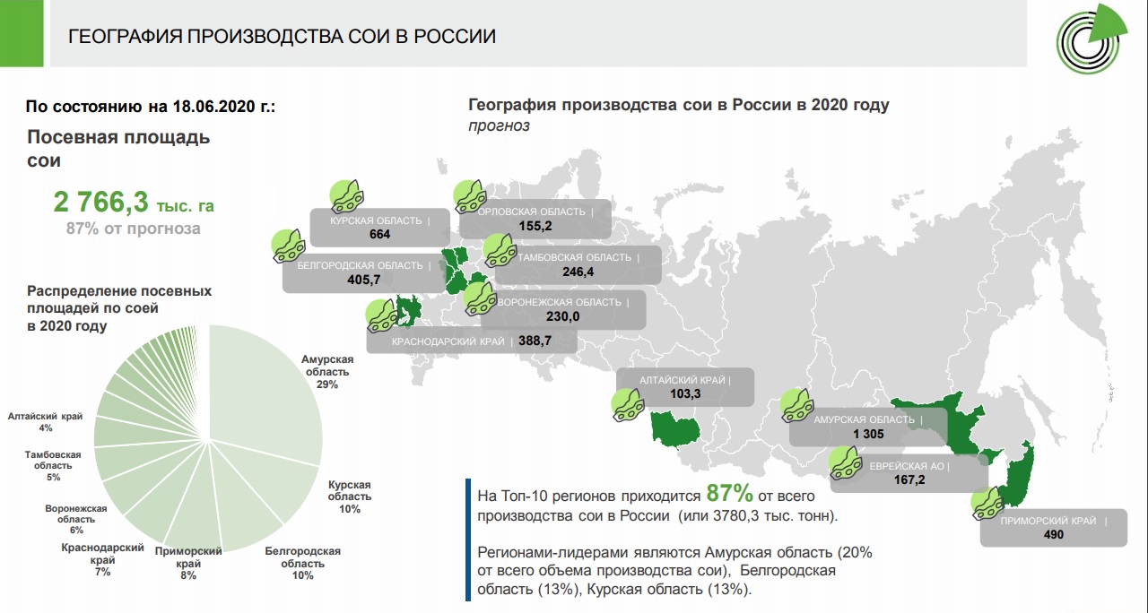Соя — стратегически важная культура, в мировом масштабе по важности она сопоставима с пшеницей, кукурузой и рисом, отметил он. Общая площадь под сою в мире в 2019 году составила 122 млн га, мировое производство, по данным Минсельхоза США, достигло 336 млн т, прибавив 30% к уровню 2010 года. На долю России в мировом производстве этой культуры в 2019 году приходилось около 1,3%.
