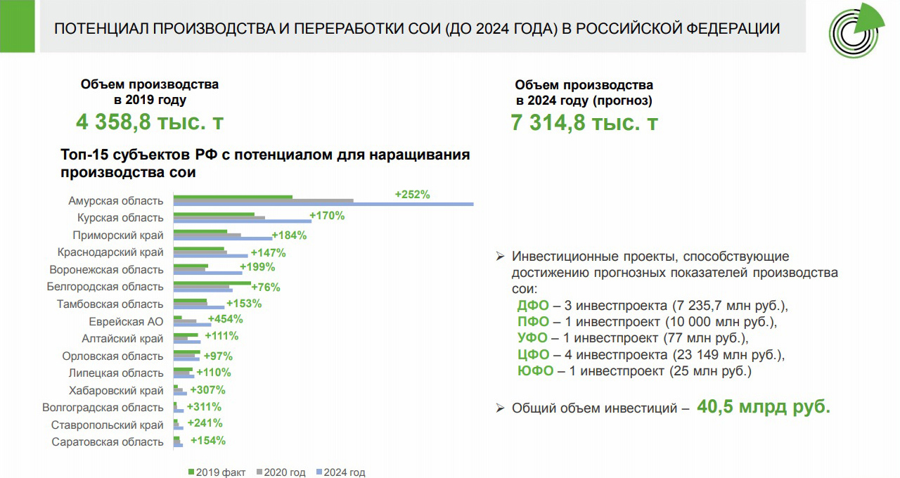 Увеличению производства сои, как отметил Дмитрий Авельцов, способствует реализация мероприятий программы развития сельского хозяйства и регулирования рынков сельскохозяйственной продукции, сырья и продовольствия на 2013–2020 годы, которая предусматривает меры государственной поддержки развития и переработки продукции растениеводства, в том числе сои. В рамках программы обозначена стратегическая задача — 100%-е удовлетворение внутренней потребности России в сое, которая составляет 5,5 млн т. Кроме того, 11 июня 2020 года кабмин одобрил распределение между 39 регионами Российской Федерации 3,3 млрд руб. субсидий на увеличение производства масличных культур.