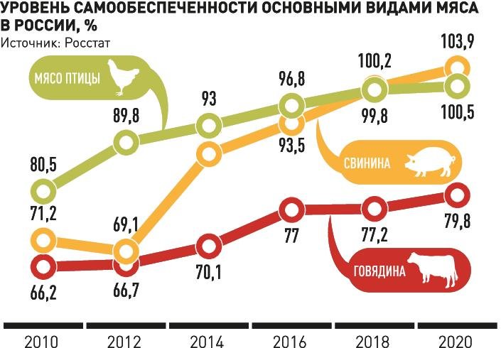 Переориентация потребительского спроса обусловлена влиянием нескольких факторов. «Одним из них является снижение потребительских цен на свинину и мясо птицы, которому способствовало достижение самообеспеченности России этими видами мяса соответственно в 2018 и 2019 годах», — поясняет Владимир Кравченко.