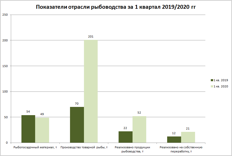 При этом производство товарной рыбы выросло с 70 т в 1-м квартале 2019 года до 201 т за аналогичный период этого года. Реализация продукции увеличилась в 2,4 раза и составила 52 т, в том числе собственная переработка — 21 т (в 1,8 раза больше, чем годом ранее).