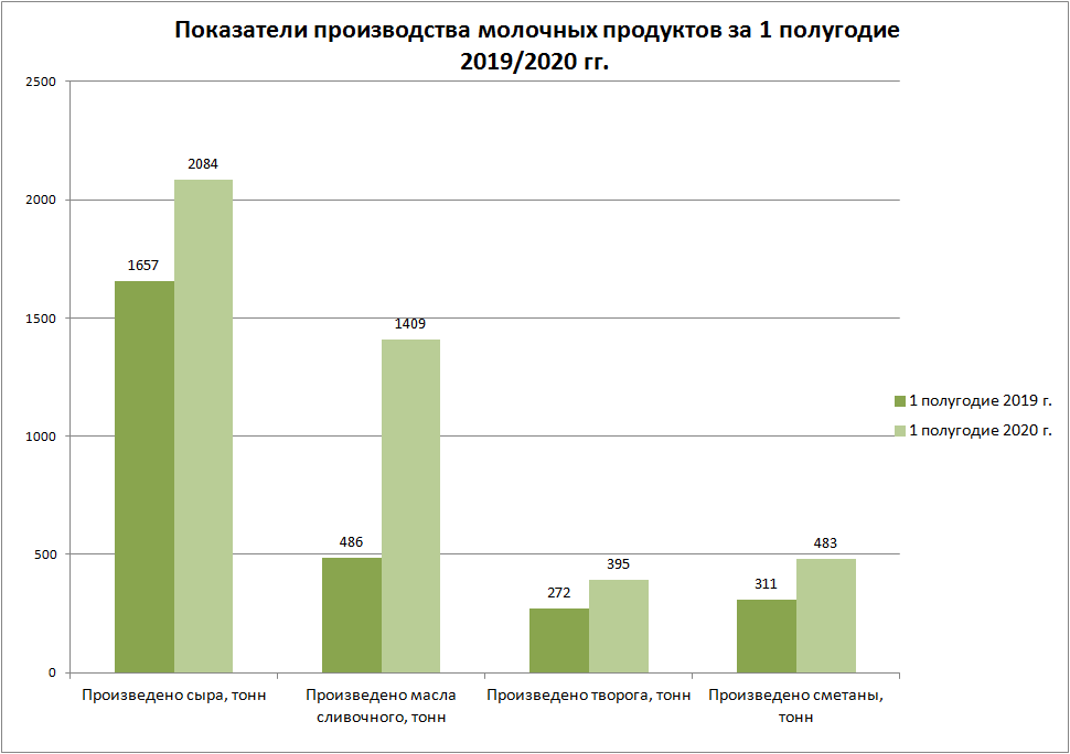 Согласно данным регионального департамента агропромышленного комплекса, за 6 месяцев 2020 года в Костромской области выпущено 2 084 т сыра, что на 25,8% больше, чем годом ранее (1 657 т). Производство сливочного масло выросло в 2,9 раза и составило 1 409 т, что выше аналогичного показателя прошлого года (486 т). Творога получено 395 т, что на 45,2% больше, чем годом ранее (272 т). Выпуск сметаны вырос с 311 т в I полугодии 2019 года до 483 т в аналогичном периоде этого года (в 1,6 раза больше).
