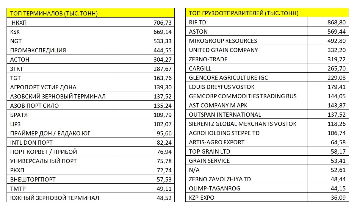 Больше всего грузов — 1 909,21 тыс. т — было отправлено из порта Новороссийск, 1 082,13 тыс. т — из Ростова-на-Дону, 968,55 тыс. т — из порта Азов. 287,67 тыс. т зерновых и зернобобовых культур отгрузили из Тамани, 163,76 тыс. т — из Туапсе, 151,18 тыс. т — из Таганрога. Менее 100 тыс. т экспортировано из таких портов, как Ейск (70,48 тыс. т), Керчь (14,68 тыс. т), Севастополь (12,22 тыс. т), Темрюк (11,16 тыс. т), Евпатория (2,21 тыс. т).