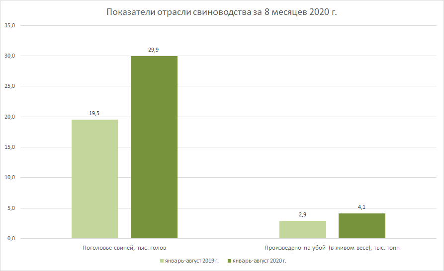 Производство свиней на убой за 8 месяцев 2020 года составило 4,1 тыс. т, тогда как в прошлом году за этот же период было получено только 2,9 тыс. т