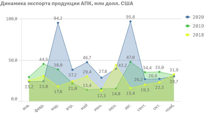 В частности, поставки подсолнечного, рапсового масел и жмыхов масличных культур, а также масел животного происхождения в этом году выросли на 80% к аналогичному периоду 2019 года и в стоимостном выражении составили 123 млн долл. США. Экспорт сахара (ТН ВЭД 17) достиг 55,1 млн долл. США, тогда как за 11 месяцев 2019 года он составлял 13,1 млн долл. США. Также значительно больше вывезли масличных культур: 58,6 млн долл. США в 2020 году против 8,2 млн долл. США годом ранее.
