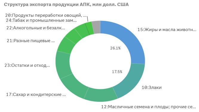 В структуре экспорта (в стоимостном выражении) на группу жиры и масла животного или растительного происхождения (ТН ВЭД 15) приходится 26,1%, на злаки (ТН ВЭД 10) — 17,5%, семена масличных культур (ТН ВЭД 12) — 12%.