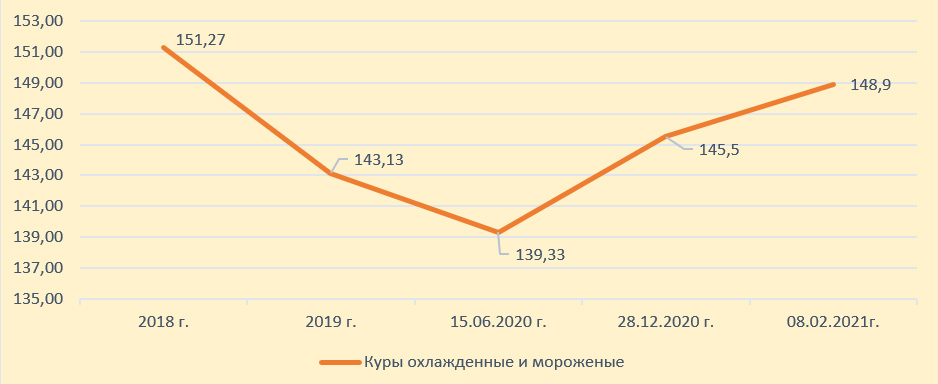 Из-за высоких объемов производства в 2020 году цены на мясо кур были рекордно низкими (график 1).