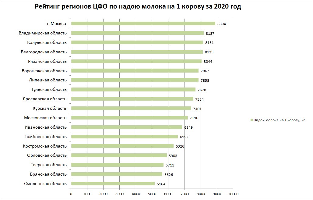 Главным образом положительная динамика производства наблюдалась благодаря росту продуктивности коров молочного стада. Так, средний надой молока от 1 коровы повысился на 7,7% и составил 6 326 кг (5 873 кг в 2019 году). По темпу прироста продуктивности коров область занимает 4-е место в ЦФО (максимум в Курской области — +13,5%, минимум в Московской — +0,8%).
