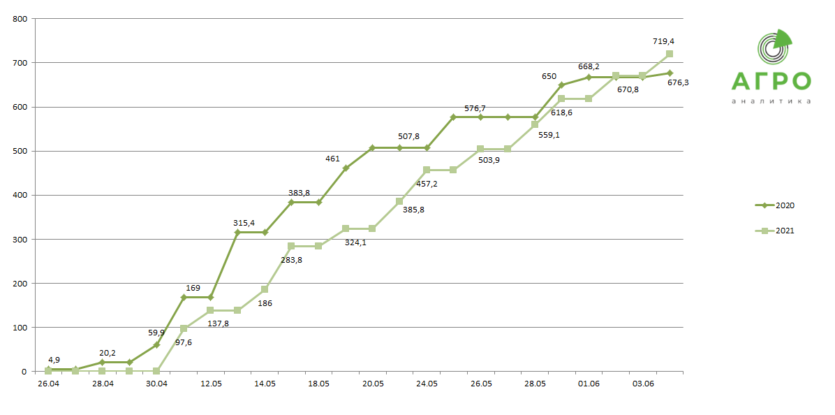 Как видно из графика, из-за поздней весны сев в 2021 году начался на две недели позже, чем годом ранее, однако аграриям удалось выйти на уровень среднемноголетних значений. Сдерживающим фактором стали и майские осадки, которые одновременно поспособствовали повышению уровня влаги в пахотном слое почвы в ряде районов, где ранее отмечался ее недостаток. В целом сев прошел в оптимальные агротехнические сроки. Также в этом году увеличилась прогнозируемая площадь ярового сева на 23,3 тыс. га.