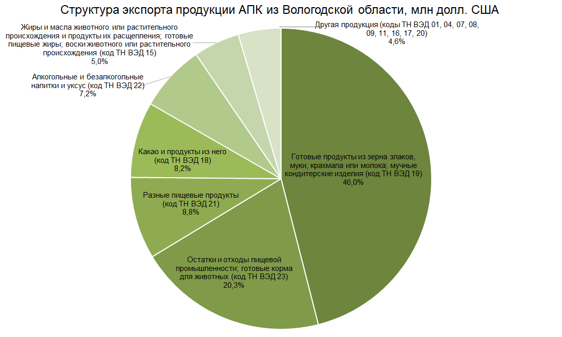 В отчетном периоде вологодская продукция АПК отгружалась в 53 страны ближнего и дальнего зарубежья. В стоимостной оценке ведущими импортерами стали Узбекистан (9,6 млн долл. США), Китай (9,3 млн долл. США) и Казахстан (5,1 млн долл. США). Узбекистан в основном закупал детское питание, расфасованное для розничной продажи (код ТН ВЭД 190110) (8,8 млн долл. США; 2,0 тыс. т); Китай — муку тонкого и грубого помола и гранулы из рыбы или ракообразных, моллюсков или прочих водных беспозвоночных (код ТН ВЭД 230120) (6,5 млн долл. США; 4,0 тыс. т), а также мороженое и прочие виды пищевого льда (код ТН ВЭД 210500) (2,5 млн долл. США; 0,5 тыс. т). В Казахстан преимущественно отгружались прочие хлеб и мучные кондитерские изделия (код ТН ВЭД 190590) (2,5 млн долл. США; 1,9 тыс. т) и водка (код ТН ВЭД 220860) (1,1 млн долл. США; 1,0 тыс. т).