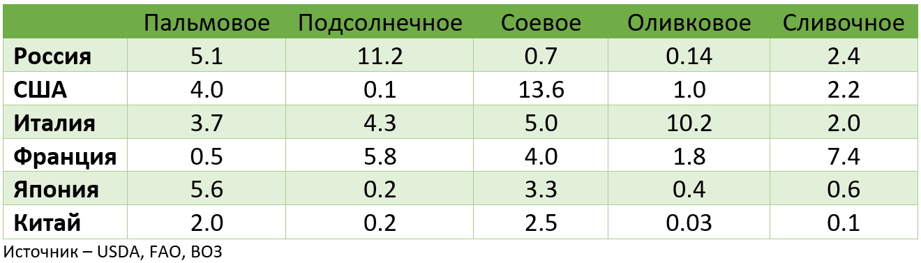 По оценке «Центра Агроаналитики», структура потребления растительных и животных масел неодинакова для разных стран, зависит от потребления других пищевых продуктов и часто связана с особенностями национальных кухонь (см. таблицу). Согласно данным Продовольственной и сельскохозяйственной организации ООН (FAO) и Министерства сельского хозяйства США (USDA), в Италии основу потребления составляет оливковое масло, в соседней Франции – сливочное, а вот в Японии — пальмовое, которого здесь потребляют больше, чем в России. Для нашей страны основным является подсолнечное масло, в США основное растительное масло — соевое. При этом французы потребляют в три раза больше сливочного масла, чем в России.