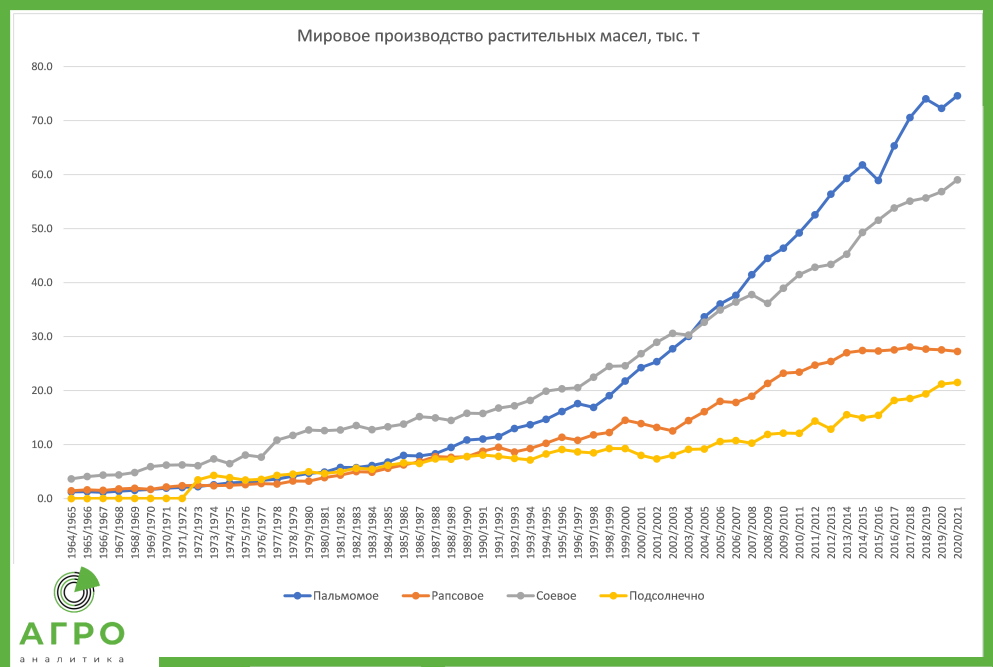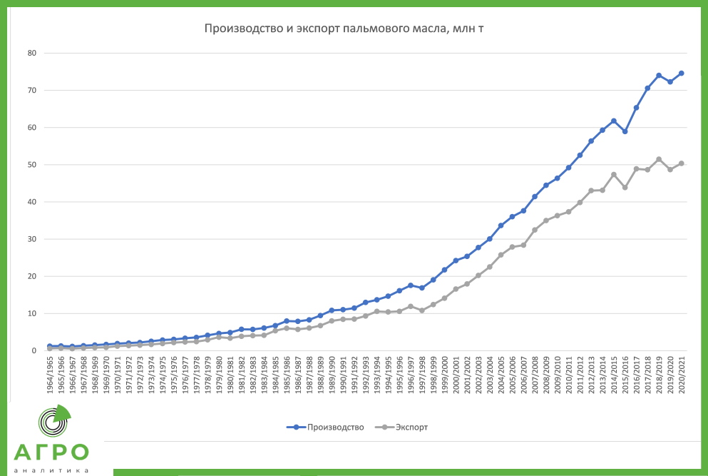 По данным «Центра Агроаналитики», за последнее десятилетие (с 2011 по 2020 годы) мировое производство пальмового масла увеличивалось в среднем на 4,2%, а мировая торговля — на 3,0%. В сезоне-2019/20 мировое производство пальмового масла составило почти 72,3 млн т, а в 2020/21 году прогнозируется его увеличение до 74,6 млн т. Для сравнения: производство соевого масла ожидается на уровне 59 млн т, рапсового – 27,3 млн т, подсолнечного – 21,5 млн т. За последние пять лет среднегодовое производство пальмового масла превысило выпуск соевого масла на 27%, рапсового – в 2,6 раза, подсолнечного – в 3,6 раза.