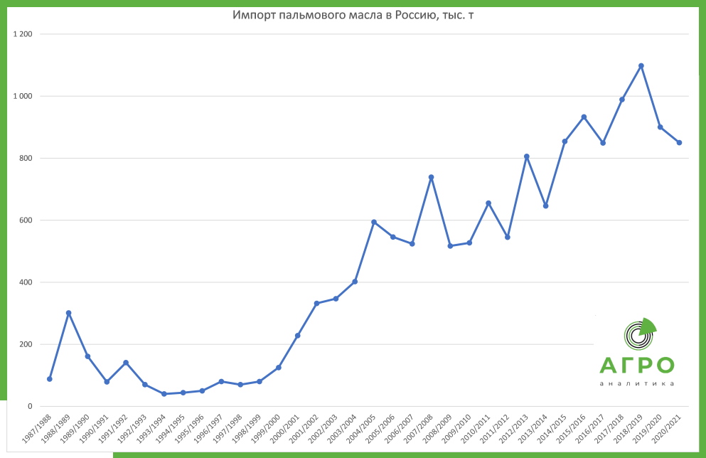 В СССР импорт пальмового масла в промышленных масштабах начался в середине 70-х годов XX века. В 80-е годы объемы импорта пальмового масла в Советский Союз составляли от 197 до 318 тыс. т в год. В связи с общим обвалом экономики в 90-е годы импорт этого продукта в Россию заметно упал и в период с 1992 по 1998 годы составлял от 40 до 80 тыс. т в год. По мере восстановления экономики в начале XXI века заметно вырос и ввоз пальмового масла. С 1999 по 2019 годы среднегодовой темп прироста его импорта превысил 12,2%. В 2019 году было ввезено более 1,06 млн т пальмового масла на сумму свыше 668 млн долл. США.