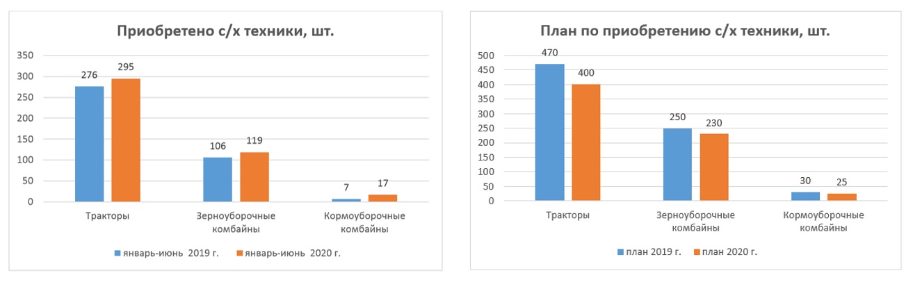 По данным минсельхоза региона, на 1 июля было приобретено 295 тракторов, план был выполнен на 73,8%, тогда как на соответствующую дату 2019 года этот показатель составлял 69%. Также было приобретено 119 зерноуборочных комбайнов (план выполнен на 51,7%, год назад — на 46,1%) и 17 кормоуборочных комбайнов (план выполнен на 68%, годом ранее — на 28%). Кроме того, аграрии Оренбургской области приобрели 510 единиц прочей сельскохозяйственной техники и оборудования, в том числе 130 сеялок и 59 культиваторов.