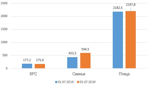 За январь — июнь СХО, не относящиеся к субъектам малого предпринимательства, по данным региональной статистики, по всем каналам сбыта отгрузили 92,9 тыс. т скота и птицы (в живом весе), или 115,7% к январю — июню 2019 г., и 38,9 тыс. т молока (93,7%).