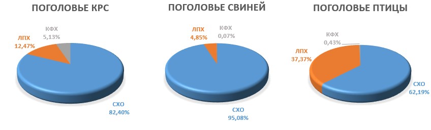 В сельскохозяйственных организациях региона (далее — СХО) содержится подавляющее большинство свиней и КРС (95,08% и 82,40% соответственно), а также почти две трети поголовья птицы (62,19%).